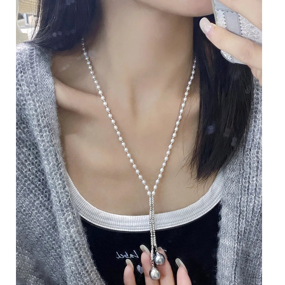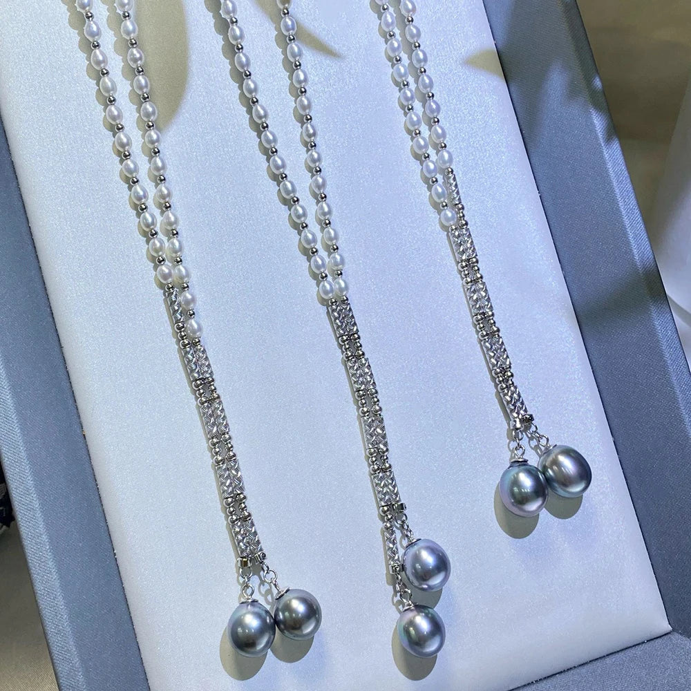 S925 Sterling Silver Real Pearl Necklace Sweater Chain with 3-4mm Freshwater Pearls and 10-11mm Tahitian Seawater Black Pearls